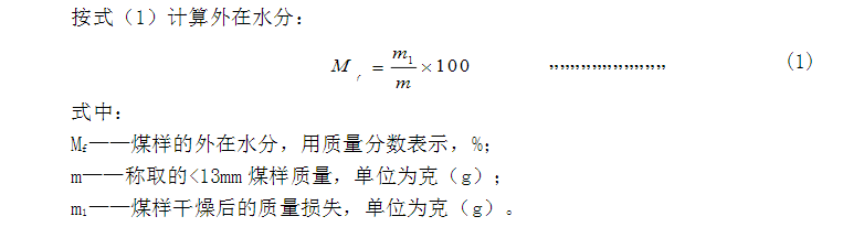 在預先干燥和已稱量過的淺盤內迅速稱取<13mm的煤樣(500±10)g(稱準**0.1g),平攤在淺盤中,于環境溫度或不高于40℃的空氣干燥箱中干燥到質量恒定(連續干燥1h,質量變化不超過0.5g),記錄恒定后的質量(稱準**0.1g)。對于使用空氣干燥箱干燥的情況,稱量前需使煤樣在試驗室環境中重新達到濕度平衡。