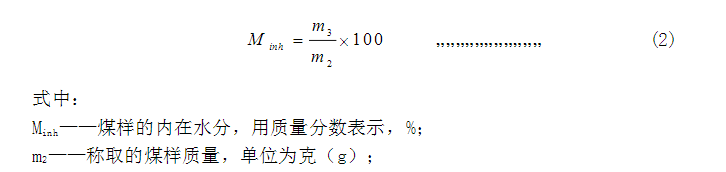 7.1.2.4 進行檢查性干燥,每次30min,直到連續兩次干燥煤樣的質量減少不超過0.01 g或質量增加時為止。在后一種情況下,采用質量增加前一次的質量作為計算依據。內在水分在2%以下時,不必進行檢查性干燥。 7.1.2.5 按式(2)計算內在水分: