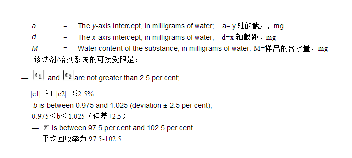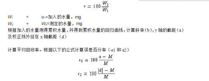 通過(guò)選擇的試劑/溶劑系統(tǒng)測(cè)定供試品的含水量。然后,通過(guò)適宜的方式(**少5次)連續(xù)加入已知量的水,每次加水后測(cè)定累積含水量。根據(jù)下面的公式計(jì)算每點(diǎn)的回收率(r):