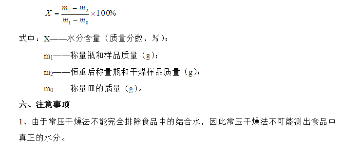 食品中水分含量指在100℃左右直接干燥的情況下所失去物質(zhì)的總量。在常壓下,將樣品放入恒溫烘箱中加熱干燥,除去水分,干燥前后樣品的質(zhì)量之差為樣品的水分含量。本法適用于在95~105℃下,不含或含其他揮發(fā)性物質(zhì)甚微的食品。 三、儀器和材料