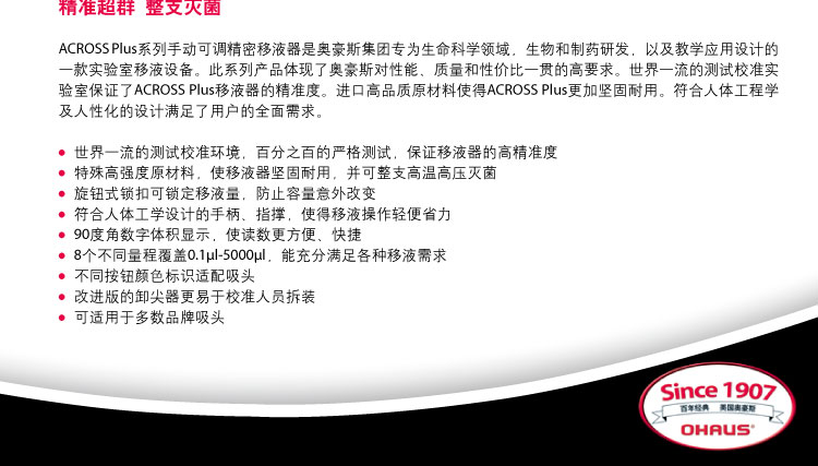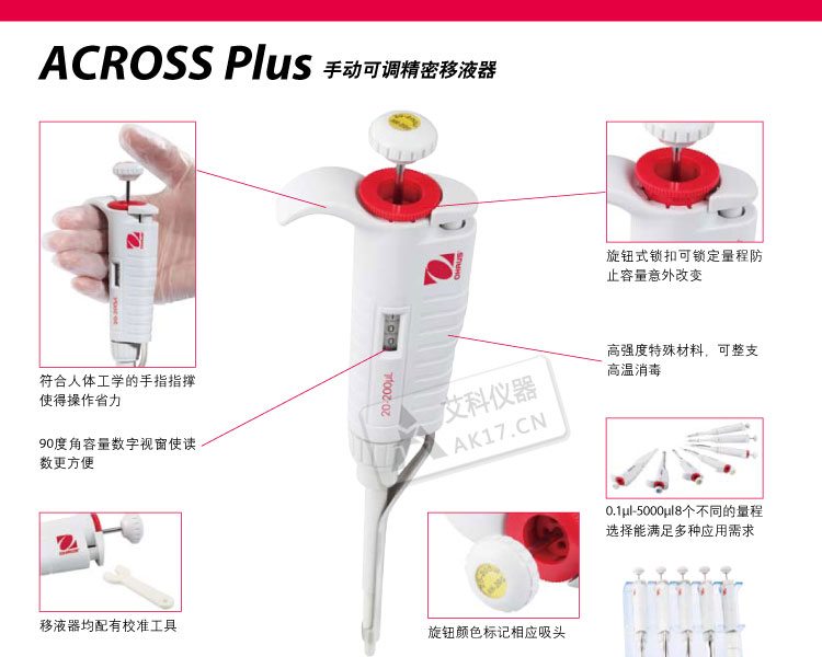 ACROSS Plus系列手動可調(diào)精密移液器是奧豪斯集團專為生命科學*域,生物和制藥研發(fā),以及教學應(yīng)用設(shè)計的一款實驗室移液設(shè)備。此系列產(chǎn)品體現(xiàn)了奧豪斯對質(zhì)量,性能和可靠性一貫的高要求。世界一流的測試校準實驗室保證了ACROSS plus出廠時的精準。進口高品質(zhì)原材料使得ACROSS Plus更加堅固耐用。符合人體工程學及人性化的設(shè)計滿足了用戶的全面需求。